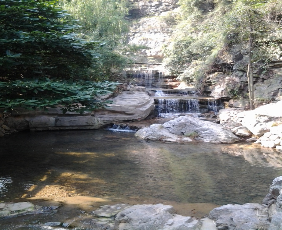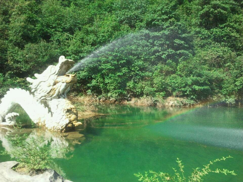 當天秋高氣爽,陽光普照,午飯后,大家背上行裝,徒步旅程開始。入門口有條白龍臥在水中,仰首吐霧向游客示意,在白龍旁邊,我們還看到了彩虹,赤橙黃綠青藍紫,我們像小孩子般的開心數(shù)著顏色,欣賞著水中泛起的陣陣漣漪……