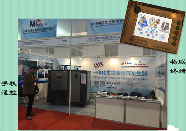 2015年11月30日到12月3日,免檢型一體化生物質蒸汽發生器亮相義烏國際裝備博覽會,和著互聯網+契機,突出智能化成果,我們的參展產品除了自動化程度高、安裝簡單、環保排放等優點,還引入了物聯網概念,借助平臺終端和手機APP程序,可以實現對蒸汽發生器的手機遠程遙控。