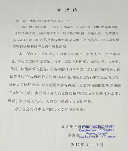 摩洛哥境內(nèi)近十年沒有新建電廠了,技術(shù)工人的知識(shí)儲(chǔ)備不足,華源前線的技術(shù)人員將圖紙拆分、簡化,并與總包方協(xié)調(diào),指派有能力的技術(shù)工人在工作中一對(duì)一的教學(xué),我們的項(xiàng)目經(jīng)理和調(diào)試工程師連著好幾天徹夜駐守現(xiàn)場(chǎng),如今終于順利點(diǎn)火了,現(xiàn)場(chǎng)總包方工作人員紛紛點(diǎn)贊,總包公司發(fā)來感謝信啦……