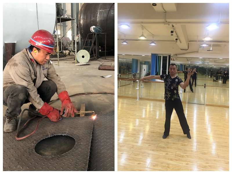 穿上工作服,他細(xì)心專注在火花閃耀的車間,腦海里只有圖紙、焊接要領(lǐng);換上舞衣,他是熱情洋溢、光芒四射的舞者,耳中聽著的只有音樂、節(jié)拍。