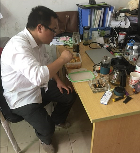 浙能黃巖熱電廠,華源前線輔助鍋爐現場辦公室內,一個褲腿、工作鞋上沾滿灰塵的眼鏡兄弟,正在快速往嘴里遞送泡面,看他大口吃得那么香,讓人不禁想,難道這是什么特制秘方泡面,有這么香嗎。