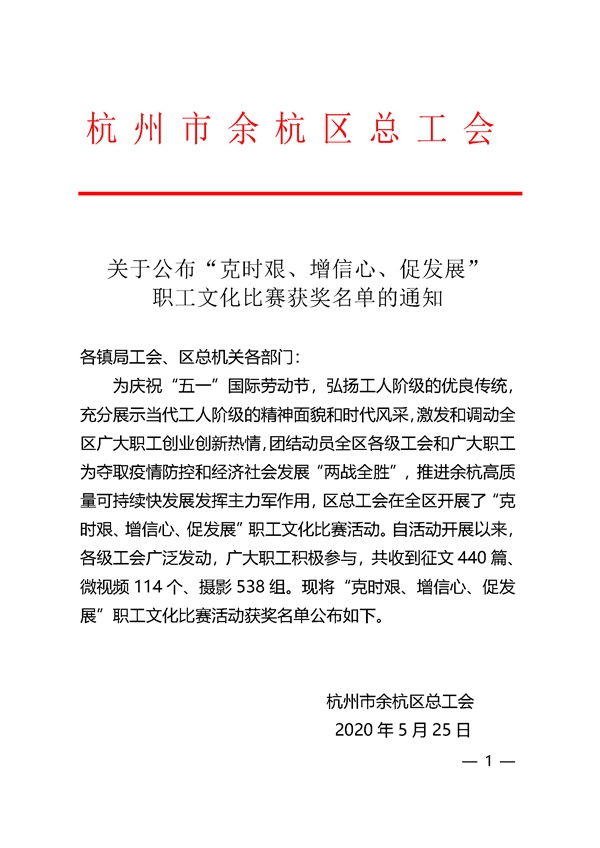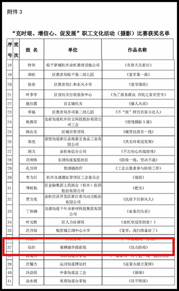“五一”國(guó)際勞動(dòng)節(jié)期間,余杭區(qū)總工會(huì)在全區(qū)開展了“克時(shí)艱、增信心、促發(fā)展”職工文化比賽活動(dòng)。華源前線總經(jīng)理工作部副經(jīng)理陸怡代表公司投稿的攝影作品“抗擊防疫”在538組攝影作品脫穎而出,榮獲“優(yōu)勝獎(jiǎng)”。 華源前線始終以謹(jǐn)慎的態(tài)度面對(duì)疫情,以科學(xué)的措施防控疫情,以堅(jiān)定的信心保障生產(chǎn),以飽滿的熱情不懈奮斗!