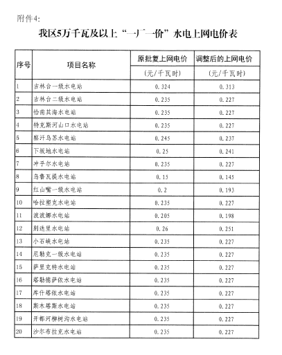 《通知》規定,因水電增值稅稅率降低至13%,相應調整新疆5萬千瓦及以上水電上網電價。水電標桿上網電價(含稅)調整為0.227元/千瓦時,南疆三地州(另含烏什縣、柯坪縣、阿瓦提縣)調整為0.251元/千瓦時。同時,自治區發展改革委原批復的5萬千瓦及以上“一廠一價”的水電上網電價相應進行調整。