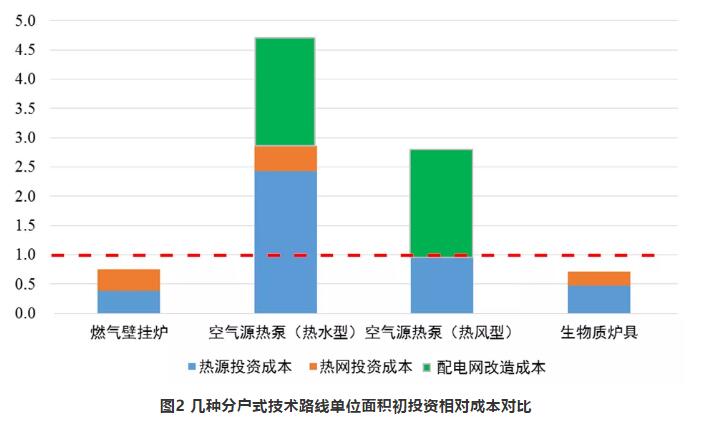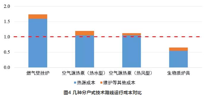 分散供暖方式中,分戶式生物質供暖運行成本最低,僅是燃煤鍋爐的0.7倍,熱泵供暖與燃煤鍋爐相當,壁掛爐供暖運行成本是燃煤鍋爐的1.5~2.0倍。
