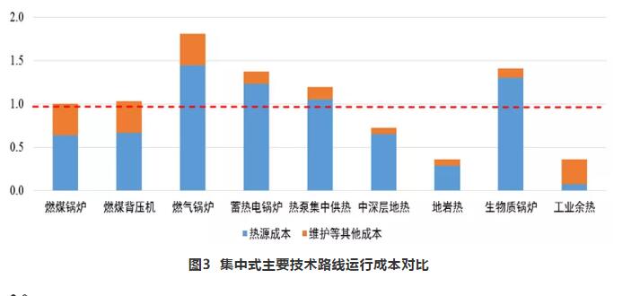 運行成本方面,集中供暖方式中,地巖熱、工業余熱供暖運行成本最低,中深層地熱運行成本低于燃煤鍋爐,4個月采暖季時燃煤背壓運行成本與燃煤鍋爐相當(采暖季達到5個月以上時,背壓機運行成本要低于燃煤鍋爐),其次是熱泵集中供暖、蓄熱電鍋爐供暖、生物質鍋爐供暖,運行成本是燃煤鍋爐的1.2~1.4倍,燃氣鍋爐運行成本最高。